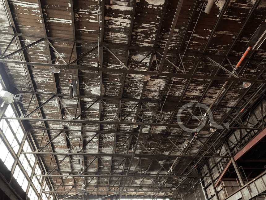 L’inspection du bâtiment a permis de voir que les fondations apparentes et la structure d’acier semblent en bon état. Cependant, l’ingénieur a noté que le bâtiment a été construit selon des techniques de construction désuètes, ce qui peut complexifier les interventions nécessaires à la mise aux normes et au renforcement de la structure. Au niveau du sol, l’infiltration d’eau et les cycles de gel-dégel ont impacté l’état de la dalle sur sol. Au niveau du toit, qui est fait en partie de bois, certaines sections ont un taux d’humidité important, entraînant un élément de dangerosité.