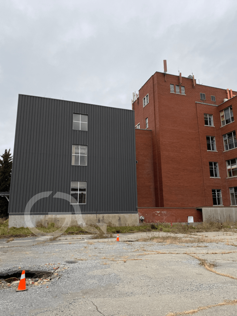 Le revêtement de l’ensemble des bâtiments est composé majoritairement de brique rouge avec des insertions de pierre. Des panneaux de tôle ont été utilisés là où d’anciennes connexions ont été démolies.