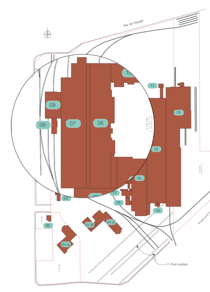 L’inspection du bâtiment a permis de constater que certaines composantes (fondation, mezzanine) à la jonction du bâtiment avec le bâtiment 06 — Atelier de tôlerie sont en piètre état dû à l’infiltration d’eau et aux cycles de gel-dégel. La structure semble toutefois en bon état. À noter que dans l’éventualité de nouvelles constructions avec sous-sol à proximité du bâtiment actuel ou d’une reconversion de la structure, d’importants travaux devront possiblement être réalisés (reprise en sous-oeuvre, mise aux normes sismiques).